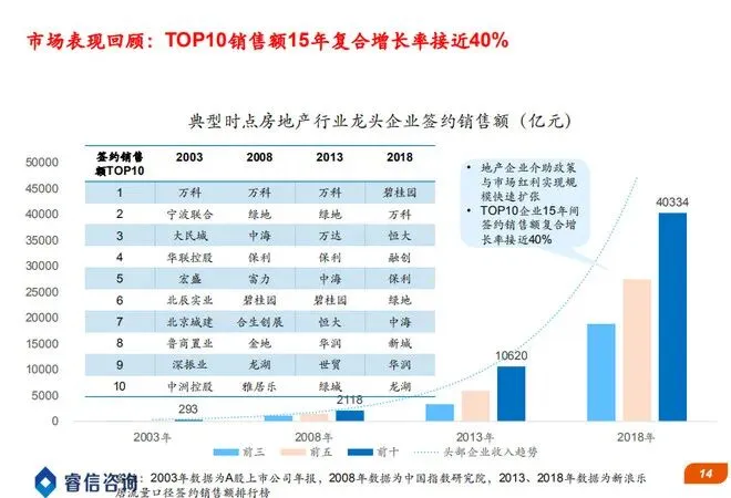 我们回顾一下房地产整体的市场,也蛮有意思。在2013和2014年出现了一个小的市场的分歧点。2013年新开工房屋面积是超过20万平,这个数据是2018年超过,2019年稍微高一点,但基本上也是在20万上下。同时,2014年商品房的竣工面积超过10亿平。到现在为止,19年的数据为19.6亿,也没有超过当年最高的高点。我们也看到2014年房地产销售面积和商品房的销售及它的增速基本进入低点,一个是-8%,一个是-6%,在这个时间点,实际上行业里的一个分水岭,有的企业对未来的后市看好,有的企业相对是有一些悲观的情绪。所以在这个阶段,大家对未来的判断出现分歧的时候,有些企业适度地减少了地产投资,甚至有部分实际上是逐步退出了地产行业。但是,实际在2015年之后,我们会发现行业的头部企业(领先的企业)的增长速度迎来更好的黄金期,我们偶尔说2015年之后是进入白银期。但整个行业的增速放缓,并没有影响到头部企业的快速增加,我们后面的数据也可以看到。前10名,从2003年不到300个亿,一直到2018年超过四万亿这样的规模,可以说增长是非常迅速的。