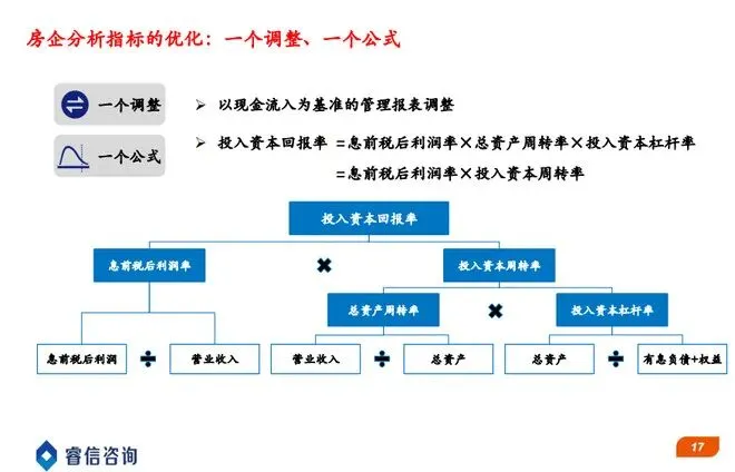 那我们其实也跟很多专家做了一个探讨,我们每年在出房地产上市公司的白皮书的时候也对此做一些研究。后来,我们做了一个比较有意思的调整;后面也会跟大家做分享。我们做了一个什么调整呢?常规房地产企业的这种经营分析,是从我们的净资产收益率,以这个为起点进行分析的,但由于结转的问题带来很大的麻烦。所以,我们从去年开始,对房地产企业的分析,其实做了一个基调的调整,是以投资资本的回报率以这个指标为核心。这一个基调的调整是什么呢?就是我会用现金流入这样的一个指标,作为最基础的指标,相当于是把它重新进行一个收入确认来看这家房地产企业的经营收入。同时,也能够更好地衡量他的周转情况;另一个是投入资本回报率,我们是把投入资本,是用有息负债和你自己的股份自有权益作为你投入房地产所有的资本。那看他的收益到底好还是坏,不管你赚的,比如说你利润高或者你周转快,最终,在这个指标中会把它体现出来。然后,在这个基础之上,再做一些相应的分解。比如,分解成息前税后的利润率以及总资产周转率,还有一个投入资本的杠杆率等这样的一些指标。这样分解完之后,我们后续做了几张图,大家有兴趣的可以仔细看一下,非常有意思。