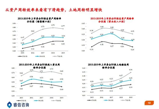 上图中(PPT19页),我们从资产的周转效率来看,基本上是处于一个下滑的趋势。这个资产周转率大家看上去会比我们常规统计的大一些,因为这个口径,我们是按照调过报表之后,也就说用现金流确认你的收入以这个为基准来调过报表之后算出来的一个数据。按照我们的分位图来讲,从2016年开始,上市公司房企的总资产周转率,在2016年到2017年是增长的,17年之后,18和19年是稳定下滑的;实际上是18、19年房地产企业整体的资产运营效率在下降。从这个投入资本周转率的数据上来看,基本还好,相当稳定;依然处于一个适度的下滑趋势,这是这几年比较重要的一个数据的特点。