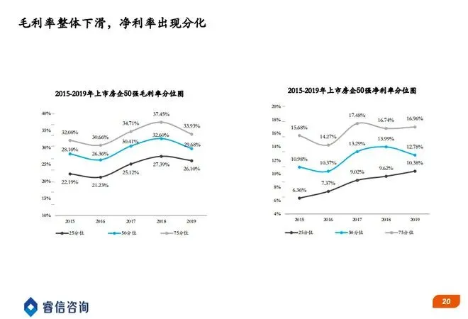 从我们的统计2019年的财务数据来看,上市房企的毛利率从2015年到2018年是稳步上涨的,2019年是明显的开始往下滑,从中位值是32降到了29.68,这个是很明显。同时,净利率的中位值2018-2019也年是稳定下滑的趋势。部分头部企业也会有一些适度增长,但总体看到,由于竞争的加剧,是下滑趋势。