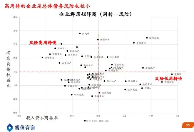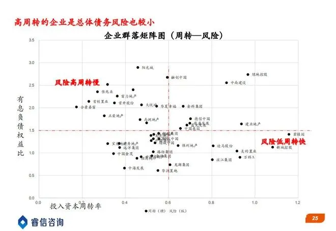 第二张图,体现的是高周转和风险之间的关系,或者说是债务风险的关系。横坐标是投入资本周转率,纵坐标是有息负债的权益比。我们看到,其实大部分企业处于风险高;只要周转慢,有息负债的权益比就比较高,整体的资金风险压力就会比较大一些,周转高的企业通常是处于风险较低的情况。当然,我们也看到一部分,周转率相对偏低,但是风险比较低的;这一部分企业其实更多是以持有运营为主的,比如像持有物业比较高的华润、招商、中海、龙湖这些企业。两方面都做的比较好的,风险低,周转快的就是在我们右下角的这个象限,处于头部的一些企业,依然是我们看到上一张表里头的万科、碧桂园、新城控股这样一些企业。