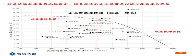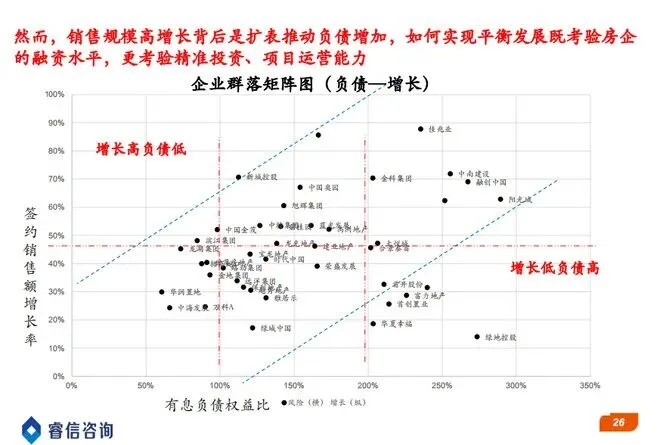 最后一张矩阵图,是增长的过程中,如何实现有效的收益和增长的平衡。我们看到的其万科就属于收益高、增长稳的企业。但是,像其他的一些中部的企业、中游的企业大部分属于收益相对偏低,但增长较快的企业。其中右上角这个象限的企业就很少了,看到我们统计的指标上,碧桂园和新城控股,在这方面做的好一些。那当然,在右下角的企业,实际上就会在两个方面都会差一些,这是我们做的非常有意思的一张图供大家做参考,尤其是在自我企业审视的过程中,会有帮助。