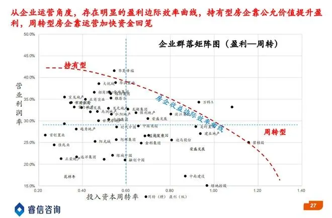 不过,这是我们自己做的一个数据分析,大家可以参考一下。在收益和周转之间,就同投入资本的回报率,现从我们的分析看,存在非常强的正相关性。有一部分是以持有型的,比如像华润、中海持有物业的比例比较高,他基本上处于中收益、中周转的这样一个位置。总体上,在过去的这几年中,高周转依然是快速提升收益的最重要的能力。