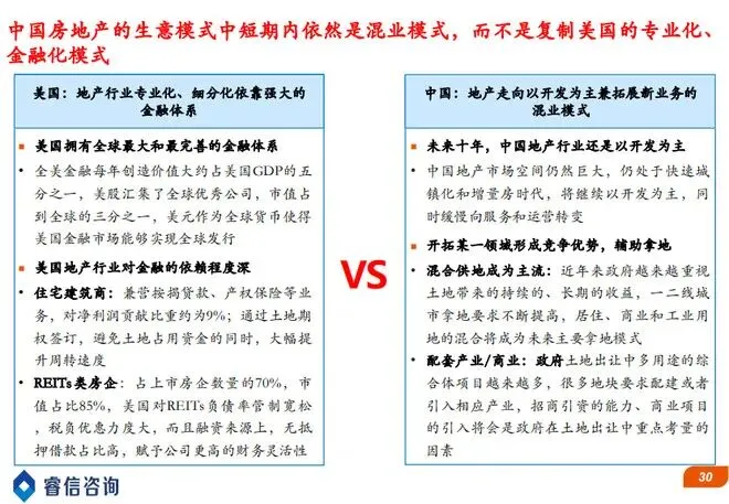 我们分析前面的数据和行业的这些标杆案例之后,我们会看到中国房地产的生意模式,可能跟美国还不完全一样,美国专业化分工分得非常的细,但中国的房地产企业我们现在看到基本上还是在做一个合理的混业经营。为什么这么说呢?你除了简单住宅开发之外,必然会有其他的多元化的业务,有两个核心目的。