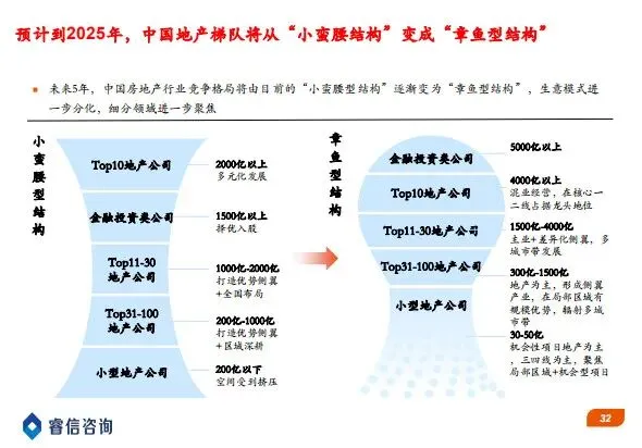 另外一个,我们认为中国房地产的整体梯队,由于头部企业的这种集中度加强,竞争格局未来会从小蛮腰(底下一堆中小企业,上面几个大企业,中部是相对比较瘦的模式)转向章鱼的模式(一种大头模式——头部企业占据市场份额更大一些),而我们认为,未来金融投资类企业可能会规模更大。那么,用权益的数据做统计,前十强的房地产企业,基本上4千亿到8千亿,前30强,应该是在1500亿到4000亿之间,30到百强应该是300亿到1500亿之间.未来依然还会存在相应的一些30-50亿到300亿以下这种中小企业,但是中小企业的数量跟以前相比会大幅的减少,他有可能在区域上有土地资源的获取能力的优势,有的是做在区域内有一些特色地产的优势。这是我们看到未来结构的一个转型。