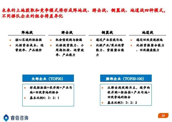 另外一个,游击战。看到中部的腰部企业,现在很多都在采用收购的模式,机会型收购和捡漏,比拼的是一种投资能力,小周期的把控能力;当然,运营效率和产品也是很重要。现在很多企业因为在一二线城市竞争中,尤其是我们说30-100强的这些企业,它竞争力并没有那么强。所以,它会通过自身的优势区域,在它优势区域和一些机会型获取的项目当中寻找一些游击的机会,最后获取一些土地,这些土地也有它的一些风险问题,基本上通过收购的方式,或者一些合作的方式来实现。