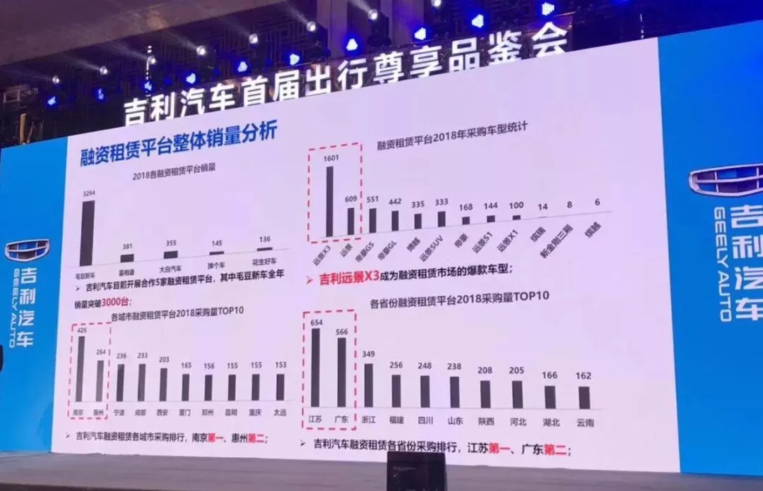 2018年,中国新车销量为2800万台,比前一年有所下跌。而2019年,预计降幅会进一步扩大。但毛豆新车的销量表现强劲,正成为一些主机厂商的新渠道。今年年初,吉利第一次把毛豆作为融资租赁的新渠道,在它的渠道商大会上展示。数据显示,毛豆作为吉利融资租赁渠道的第一名,2018年整体销量是2-5名销量总和的3倍有余。
