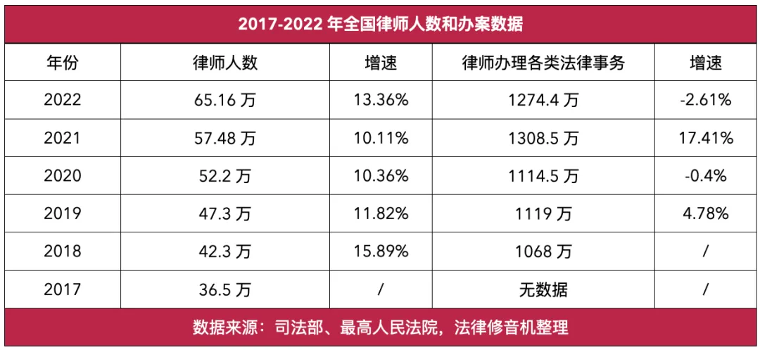 统计数据显示,截至2022年底,全国共有执业律师65.16 万多人,对比2021年统计数据,2022年全国执业律师人数比上一年度新增7.68万,涨幅超13%。