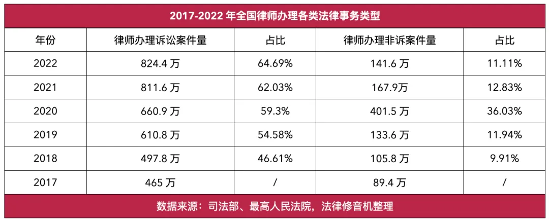 近年来,我国律师人数持续增长,每年增速均超过 10%,并且有所加快。然而,在律师人数增长的同时,律师办理各类法律事务的数量却增长放慢,2022 年还出现了负增长,“僧多粥少”的问题越来越大。