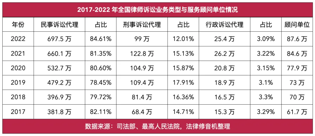 总体上看,律师办理案件的增速远低于律师人数的增速,竞争逐渐白热化。