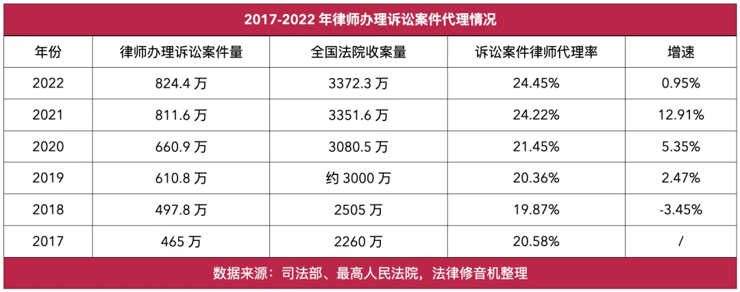 数据显示,近年来诉讼案件律师代理率持续增长,2021 年提高到 24.22%,2022 年较 2021 年略微增长,为 24.45%。较低的律师代理率,说明整个律师服务市场仍处于快速增长期,但这一增速已明显加快。
