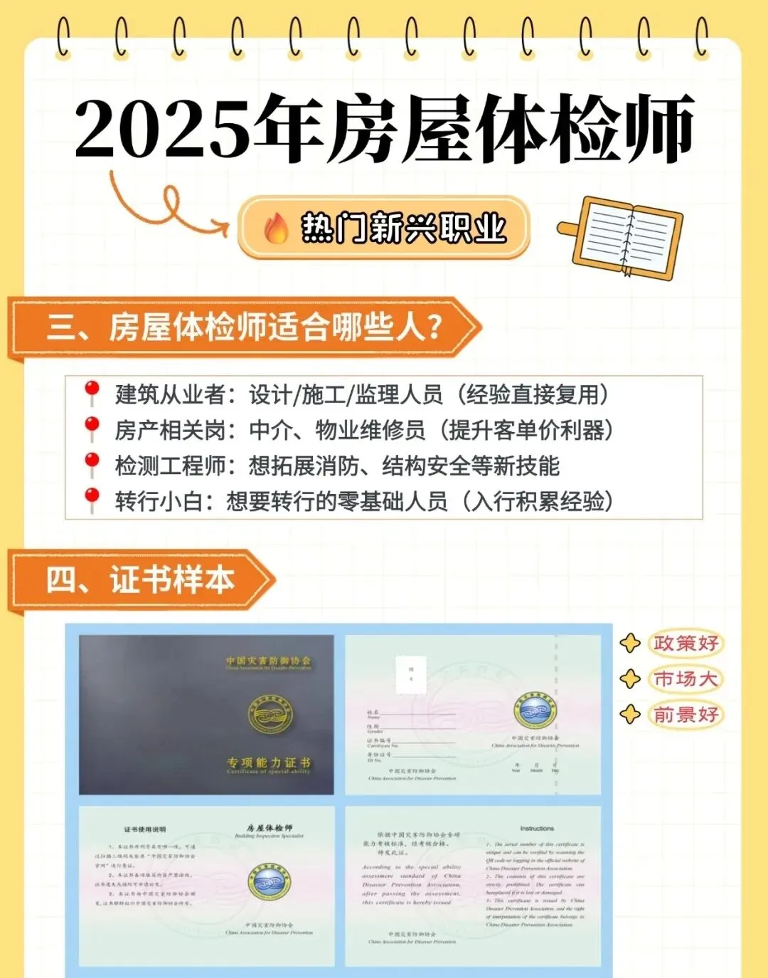 · 对比传统验房师,房屋体检师证书含金量更高,覆盖建筑结构、消防、环境等跨学科知识,职业壁垒显著提升。