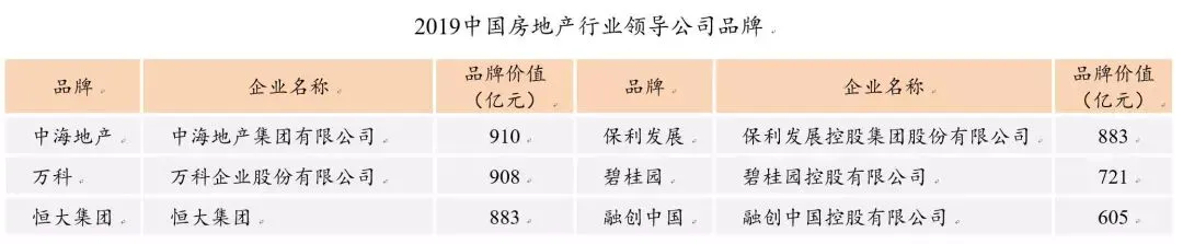 2019全国品牌企业品牌价值均值为364亿元,同比大幅增长37.13%。其中行业领导公司品牌中海地产、万科、恒大集团、保利发展、碧桂园和融创中国的品牌价值分别达910亿元、908亿元、883亿元、883亿元、721亿元和605亿元。