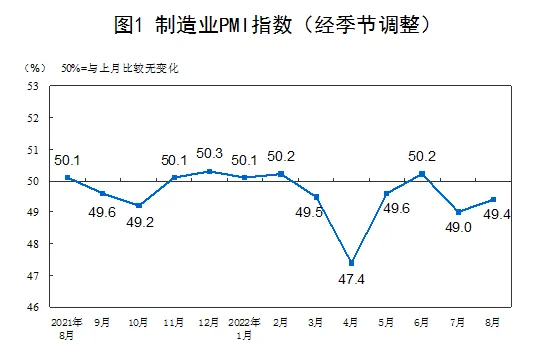 8月,制造业采购经理指数(PMI)为49.4%,低于临界点,比上月上升0.4个百分点,制造业景气水平有所回升。