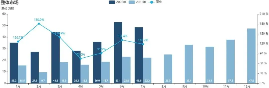 2022年7月新能源专用车市场销量2.4万辆,同比增长66%。2022年1-7月达到12.4万辆,同比增长76%,增速较强,实现倍增的增速水平。目前看,今年新能源专用车走势将大幅超强于传统轻型车市场。