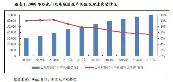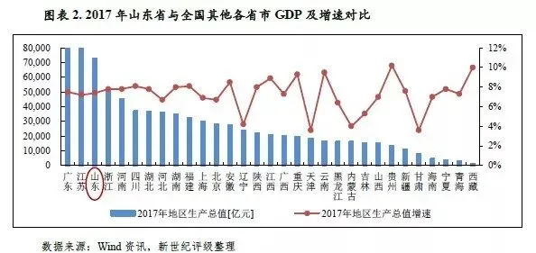 经济实力:山东省是我国重要的工业、农业和人口大省,近年来经济保持增长。2017年,山东省实现地区生产总值7.27万亿元,仍位列全国各省市第三位,仅次于广东省和江苏省;同比增长7.4%,增速较上年下滑0.2个百分点,在全国处于中游水平,高于全国GDP增速0.5个百分点。近年来山东省第三产业保持较快增长,产业结构持续优化,以服务业为主导的产业体系正逐步形成,2017年服务业对全省经济增长的贡献率为56.4%。山东省工业以重工业为主,纺织服装、机械、化工、冶金、建材、医药等传统支柱行业多为资源、能源型产业,多数处于价值链中低端,工业发展面临较大的环保及技术转型升级压力。作为我国重要的对外贸易口岸之一,2017年山东省外贸形势有所好转,全年实现货物进出口总额1.78万亿元,同比增长15.2%,扭转了前两年持续下滑的局势。投资和消费仍是拉动山东省经济发展的主要驱动力,近年来山东省固定资产投资增速逐年放缓,消费对全省经济增长的支撑作用有所增强。2018年前三季度,山东省实现地区生产总值5.96万亿元,同比增长6.5%,低于全国平均水平0.2个百分点,增速下滑明显,主要受当期基建投资放缓拖累全省固定资产投资增速下降至5.8%所致;同期社会消费品零售总额和进出口增速分别为9.3%和4.8%。
