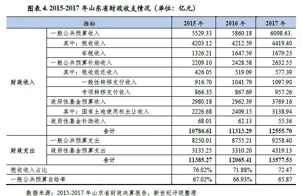 山东省财政实力较强,全省财政收入以一般公共预算收入为主,近年来保持增长,但与经济总量相比,单位地区生产总值形成财政收入的能力相对较差,且近年来公共财政自给能力有所趋弱。得益于国有土地使用权出让收入的增加,2017年山东省政府性基金预算收入实现大幅增长,对地方财力贡献度有所提高。