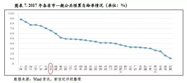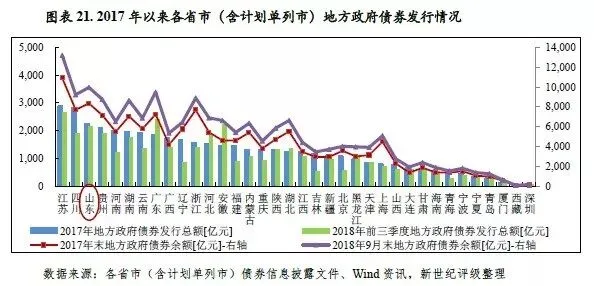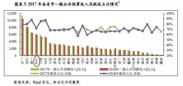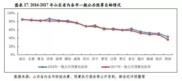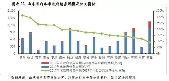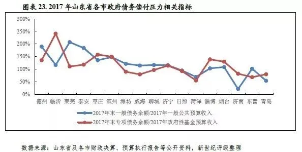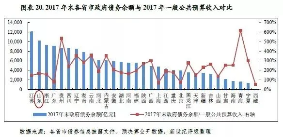 以地方政府债务余额与一般公共预算收入规模相对比,2017年末山东省地方政府债务余额是其当年一般公共预算收入的1.67倍,位列全国各省市该指标升序排列第10位。与地方综合财力相比,当年末山东省政府债务余额是2017年全省财政收入合计的81.21%,整体看山东省政府债务风险可控。