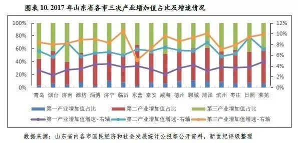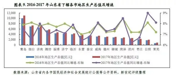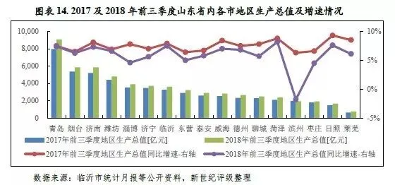 山东省内各市经济仍呈现为沿海和省会城市经济较发达,内陆城市经济发展相对较均衡,以采矿、钢铁等传统产业为主导的城市经济实力偏弱的发展格局。2017年山东省各市经济均保持增长,大多数地市经济增速处于7%至9%区间。从经济总量看,青岛市经济实力强,2017年仍以较大优势居全省各地市首位,也是山东省内经济总量唯一超万亿元的地市;沿海的烟台市、潍坊市及省会济南市经济总量均超过5000亿元;而以钢铁为支柱产业的莱芜市当年GDP尚不足千亿元。2018年前三季度,山东省各市经济增速较上年同期均有不同程度的下滑,且整体增速偏低,滨州市当期地区生产总值出现负增长。