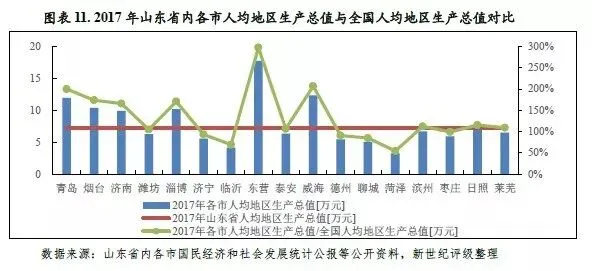 从人均经济指标看,2017年东营市、威海市、青岛市、烟台市、淄博市和济南市人均地区生产总值规模较大,分别为17.74万元、12.33万元、11.94万元、10.37万元、10.18万元和9.90万元;与当年全国人均地区生产总值相比,比率均超过150%。同年,人均地区生产总值规模较小的为聊城市、临沂市和菏泽市,分别为5.06万元、4.14万元和3.25万元;与当年全国人均地区生产总值相比,比率均小于90%。