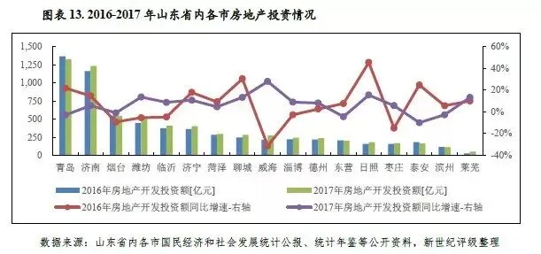 房地产投资方面,从投资增速看,2017年山东省各市房地产投资增速总体差异较大,当年泰安市、东营市、青岛市、滨州市和烟台市房地产投资有所下滑,同比分别下降9.9%、4.4%、2.8%、2.6%和0.9% ,其中烟台市已连续三年呈负增长状态。除上市5个地市外,其余地市2017年房地产投资均有所增长,但增速差异较大,其中威海市2017年房地产投资增速由上年的-31.3%提升至28.1%,增速居全省各市首位,也是省内当年增速变动最大的地市。此外,日照市、潍坊市、莱芜市和济宁市当年房地产投资增速也达两位数,处于10.8%至13.7%区间;其余地市增速处于4.7%(菏泽市)至9.0%区间。从房地产投资规模看,青岛市、济南市投资规模较大,且与其他地市存在较大差距,2017年分别为1330.5亿元和1232.60亿元,排名次之的为两个沿海城市烟台市和潍坊市,当年房地产投资分别为546.21亿元和504.10亿元;莱芜市房地产开发投资规模最小,2017年仅为53.44亿元;东营市、泰安市、枣庄市、日照市和滨州市投资规模也相对较小,处于110亿元至200亿元区间,其余各市房地产开发投资规模处于230亿元至410亿元区间。