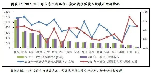 经济增速方面,2017年山东省各市经济均保持增长,大多数地市经济增速高于全国平均水平(6.9%)。当年经济增速排名靠前的分别为日照市(9.0%)、菏泽市(8.5%)、威海市(8.1%)、莱芜市(8.1%)和济南市(8.0%),同比增速均不低于8.0%;另有临沂市、青岛市、聊城市增速高于全省平均水平(7.4%)。经济增速较低的分别为滨州市(6.2%)、东营市(6.4%)、烟台市(6.5%)、枣庄市(6.7%)和泰安市(6.8%),其余地市增速处于7.0%~7.4%区间。从增速变动看, 2017年日照市和莱芜市经济增速较上年均提高0.9个百分点,增幅并列居全省第1位。其中,2017年得益于钢铁价格大幅上涨,日照市支柱产业钢铁行业增加值同比增长39.8%,重点行业中另有造纸和纸制品业增长较快,同比增速为18.6%。莱芜市是山东省钢铁生产和深加工基地,近两年钢铁产业占工业经济的比重在40%左右,2017年钢铁行业形式转好,2017年1-11月莱芜市钢铁行业增加值同比增长7.29%,机械、电力、食品和建材等行业增速较高,同期同比增速分别为12.92%、35.99%、16.31%和11.54%。此外,济南市、临沂市、威海市、德州市和聊城市2017年经济增速较上年也有所提升,但变动不大,增幅在0.1至0.3个百分点,菏泽市增速与上年持平,其余地市经济增速较上年均有所下滑,烟台市增速较上年下降1.6个百分点,其他地市降幅在1个百分点内。烟台市为山东省制造业强市,2017年经济增速下滑主要受汽车制造业、化学原料和化学制品制造业等传统主导产业下行影响,烟台市2017年工业增加值同比增速为6.2%,较上年下滑2.1个百分点。