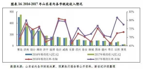 从一般公共预算收入构成看,山东省各市公共财政收入质量尚可,2017年大部分地市税收比率在70%以上,且除烟台市、临沂市、威海市和潍坊市当年税收比率较上年分别下滑5.11个、1.26个、0.89个和0.70个百分点外,其余地市2017年税收比率较上年均有所提升,日照市增幅最大,当年税收比率由上年的72.41%提升至81.62%,该比率居全省各市首位,其余地市税收比率增幅在4.51个百分点以内。作为省会城市,济南市财政收入质量较好,2017年税收比率为80.00%。2017年税收比率低于70%的地市为烟台市、淄博市、济宁市和东营市,处于67.84%至69.50%区间,其余地市该比率在70%至80%区间,其中临沂市和威海市税收比率相对较高,分别为79.76%和79.32%。从税收收入增长看,2017年烟台市和临沂市税收收入有所下滑,当年税收收入较上年同比分别下降3.1%和4.4%,其余地市税收均有所增长。得益于增值税及企业所得税的增加,日照市税收收入实现大幅增长,同比增速为23.8%;莱芜市当年税收也实现两位数增长,为12.0%;泰安市和济宁市增速最低,分别为1.0%和1.3%,其余地市增速在2.4%至8.8%区间。