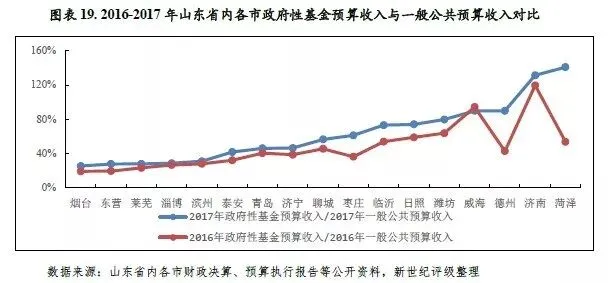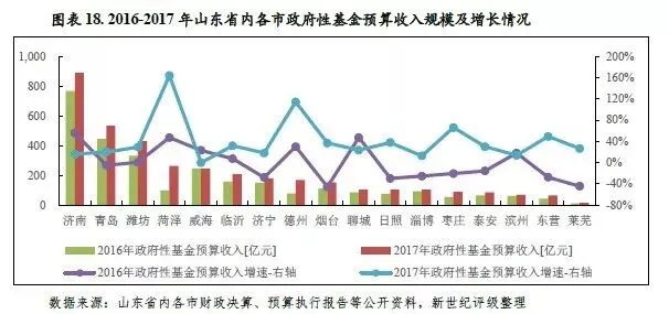 从政府性基金预算收入的增长情况看,在上年大多数地市政府性基金预算收入出现下滑的情况下,2017年除威海市政府性基金较上年略有下降(降幅为0.07%,上年同比增速为22.9%)外,其余地市收入规模提升较大,且均实现两位数增长。2017年菏泽市和德州市政府性基金预算收入实现翻倍增长,同比增速分别为163.9%和114.2%;枣庄市、东营市、日照市、烟台市、临沂市和泰安市增速也处于高水平,分别为66.0%、49.2%、37.8%、37.0%、31.7%和30.1%。青岛市、潍坊市、聊城市和莱芜市增速处于20%至30%区间,济南市、济宁市、淄博市和滨州市增速处于12%至19%区间。