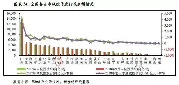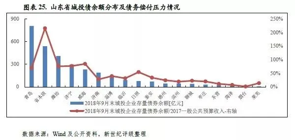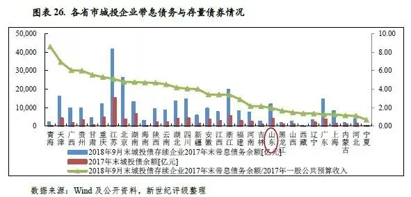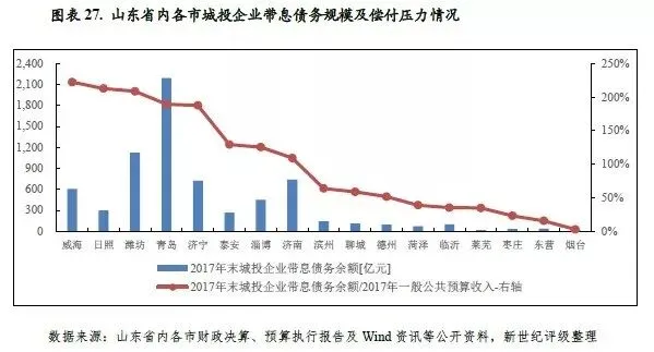 从已发债城投企业带息债务看,2017年末山东省已发债城投企业带息债务余额为11931.24亿元,居全国各省市第10位,其中存量城投债占比为25.95%;2017年末山东省已发债城投企业带息债务余额为当年一般公共预算收入的1.96倍,居全国各省市该比例降序排列倒数第10位。