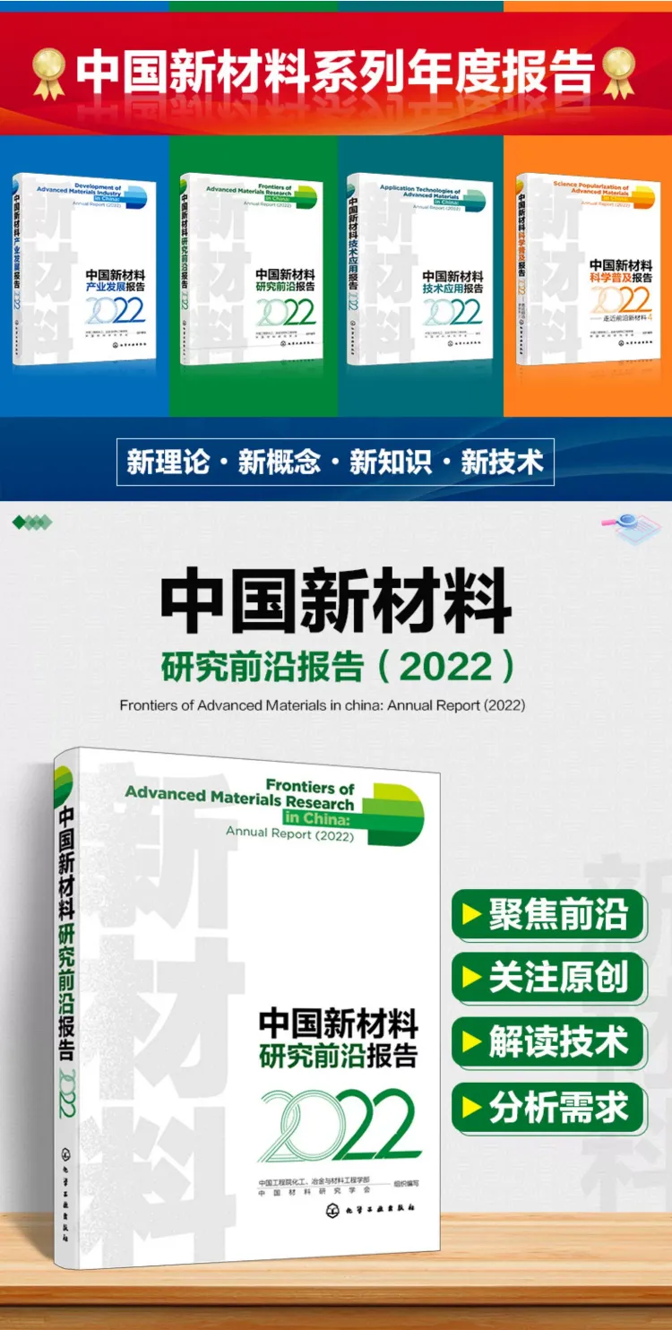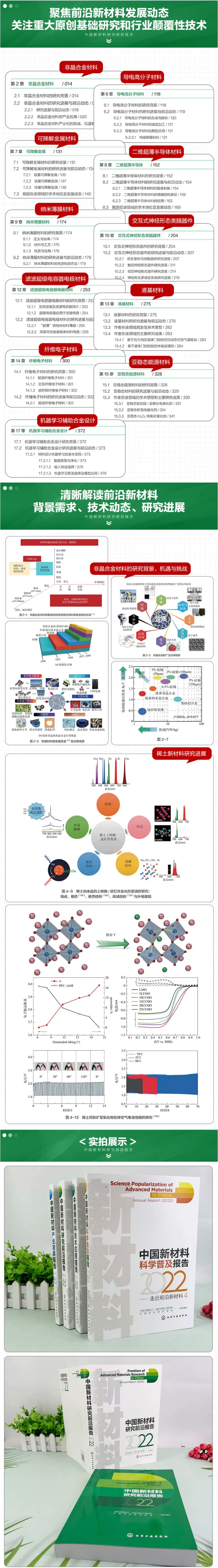 《中国新材料研究前沿报告(2022)》(以下简称《报告》)是在中国材料研究学会承担中国工程院重大战略咨询项目《关键战略材料研发与产业发展路径研究》所取得的研究成果的基础上完成的专题研究报告,是四部出版物之一。《报告》坚持以国家重大战略需求为导向,重点攻关“卡脖子”关键核心技术,聚焦关键战略材料的最新研究动态,深入开展调查研究,关注重大原创基础研究、提升基础创新能力、构建制造和应用核心技术自主发展体系,形成了多篇兼具专业性、前瞻性、时效性的专题调研报告,从而推进新材料行业重大原创或颠覆性技术开发的新学术生态。《报告》各章包含研究背景、全球研究进展与前沿动态、我国研究发展现状及学术地位、作者在该领域的主要研究成果和学术成就、我国在该领域近期研究发展重点及展望等。《报告》涉及的新材料包括非晶合金材料、导电高分子材料、纳米薄膜材料、纤维电子材料、生物降解材料、新型半导体材料等。