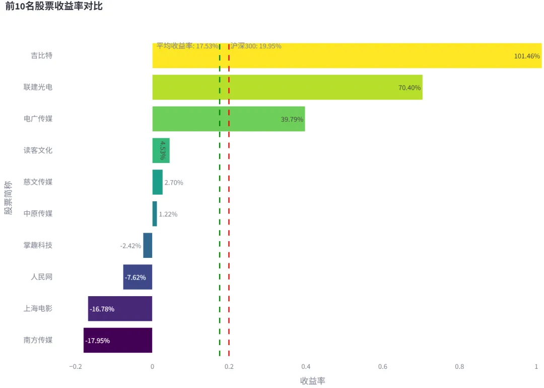 Tr函数实现。该函数接收财务综合评价模块输出的股票排名、年份和排名数量,选取前N名股票作为投资组合。然后,对于每只股票,使用tushare库获取其次年5月1日至12月31日的后复权价格数据,并计算持有期间的收益率。同时,获取同期沪深300指数的收益率作为基准。最后,计算投资组合的平均收益率,并与基准收益率进行比较。该模块返回组合平均收益率、基准收益率以及每只股票的详细收益率数据。其核心逻辑如下:create_return_visualization和create_ranking_visualization。前者用于创建收益率对比条形图,将每只股票的收益率以水平条形图展示,并在图中添加组合平均收益率和基准收益率的参考线。后者用于创建综合得分排名条形图,将股票按综合得分从高到低展示,并根据排名数量动态调整条形图的颜色、宽度和布局参数,以确保可视化效果清晰美观。效果展示分别如下图: