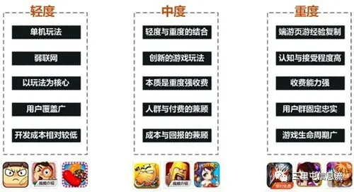 一般根据游戏的玩法、付费、用户占有率、arpu值以及玩家留存等特点可以将游戏分为以下三类: