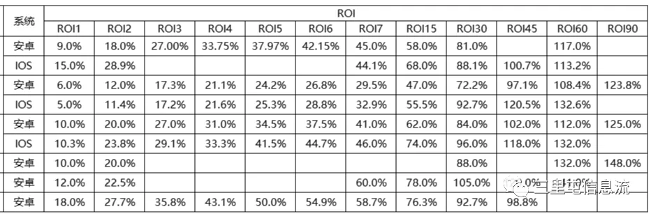 总结来说就是重度手游多半都会有一定的群众基础,游戏的玩法比较深入,游戏内的运营活动会持续更新,玩家粘性较高,土豪玩家多,但是人群覆盖量不如中轻度手游,一般我接触到重度手游回收周期大概在2-3个月左右,ltv增长特点次日是首日的2倍,7日是次日的2-2.5倍(不代表所有游戏),下面是我之前投放的多款游戏的ROI增长KPI,实际的投放效果可能与KPI有一些差距,下表供大家参考,以下游戏产品包括传奇/三国/仙侠