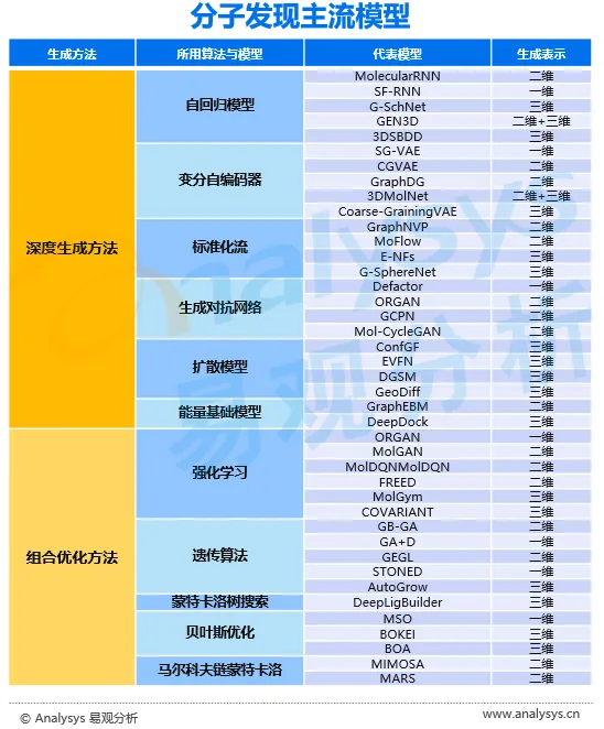 目前分子发现的生成方法主要分为深度生成方法与组合优化方法,深度生成方法将各种分子的可能性视为连续的概率并利用生成模型对分子数据进行概率建模,而组合优化方法则是将分子根据不同性质离散化并根据预期生成分子的性质选择生成策略。