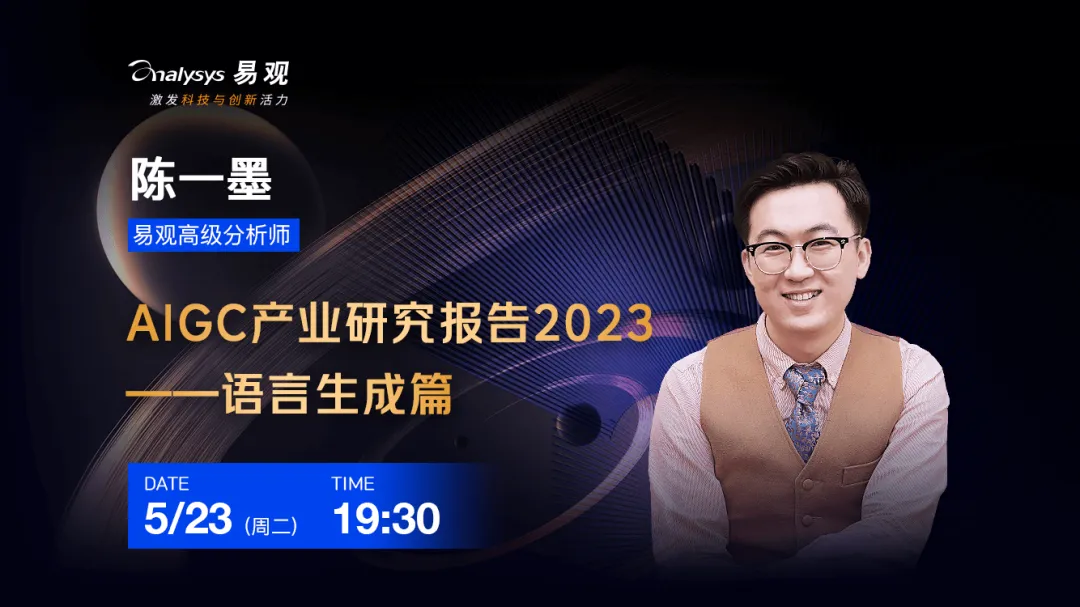 今日19:30,易观高级分析师陈一墨将在易观分析视频号直播解读《AIGC产业研究报告 2023——语言生成篇》,欢迎预约观看!