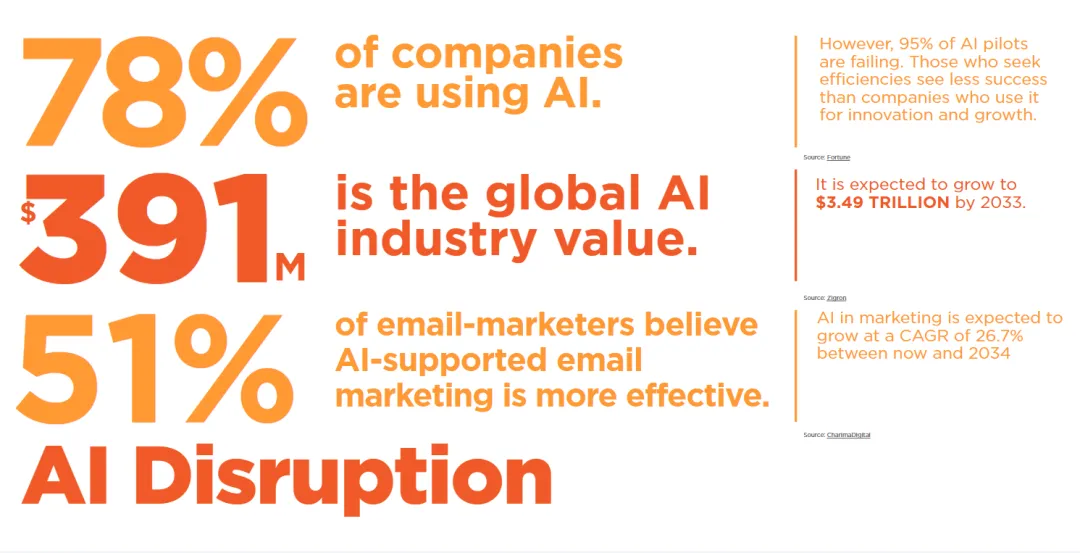 Exhibit 1:AI产业价值与应用现状图(研报第28页),这张图直接揭露AI行业的真相:78%的企业都在布局AI,但95%的AI试点以失败告终。图表左侧标注全球AI产业当前价值3910亿美元,右侧预测2033年将飙升至3.49万亿美元,下方补充营销领域AI年复合增长率达26.7%(2034年前)。这组数据说明,AI不是伪命题,但想靠它提效难,靠它创新才能突围,未来十年将是AI泡沫与机遇并存的十年。