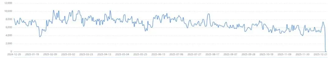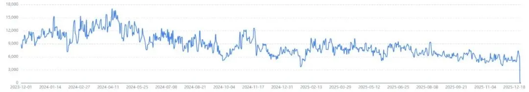 最近两年泉州法律服务市场的搜索趋势:从2023年12月到2025年12月,排除节假日等公共假期,每天的搜索量在4000到16000之间,稳定区间6000到9000。最近两年,泉州整体搜索趋势一直在缓慢下降,和峰值相比,有较大萎缩。