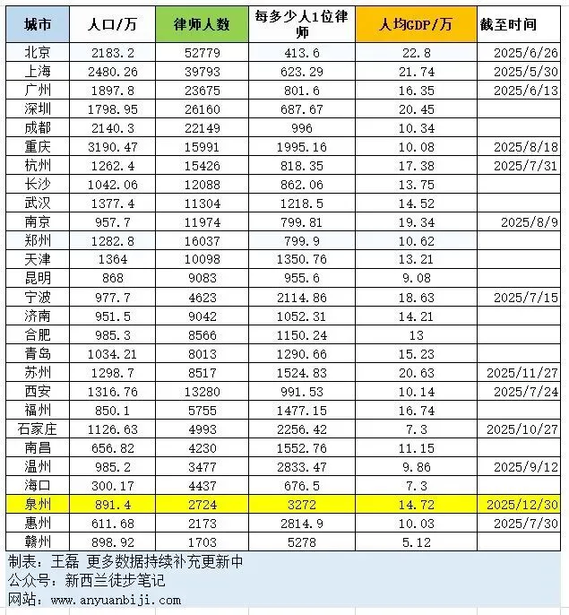 下表展示泉州与26个主要城市的律师行业服务供需数据: