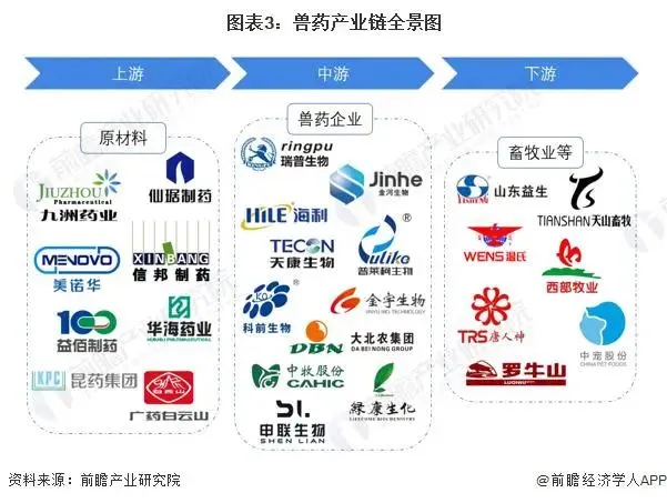 目前,我国兽药上游的代表企业包括白云山、信邦制药、仙琚制药、昆药集团等。中游企业较多,包括瑞普生物、天康生物、普莱柯、金河生物、绿康生化等兽药企业。下游主要为畜牧业等行业,主要上市公司包括温氏股份、唐人神、西部牧业等。