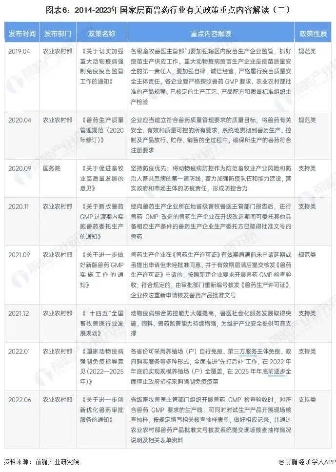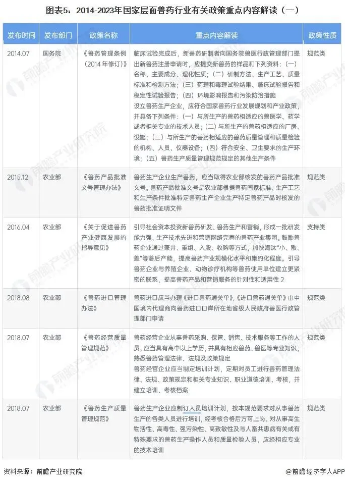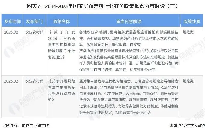 2014 年以来,我国颁布的兽药行业相关政策多为规范性政策。2021 年国家陆续发布《关于进一步做好新版兽药 GMP 实施工作的通知》、《" 十四五 " 全国畜牧兽医行业发展规划》,以及 2023 年 2 月最新出台的《关于开展规范畜禽养殖用药专项整治行动的通知》等,都立足于规范兽药行业发展。