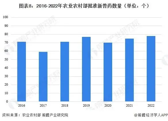 近年来,我国各家兽药企业积极研发,农业农村部批准新兽药数量波动上升。2018 年以来,我国每年新兽药批准数量维持在 70 个以上," 十三五 " 期间共批准国内新兽药 355 个,2022 年批准新兽药 78 个,创历史新高。