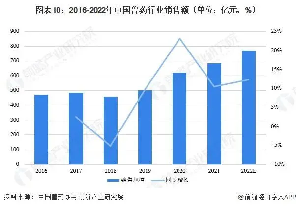 尽管近年来兽药行业企业数量有所下滑,市场的销售额依然维持爬升。2016-2021 年,国内兽药产品销售规模由 472.29 亿元增长至 686.18 亿元,年均复合增长率约为 8%,预计 2022 年销售额有望突破 770 亿元。