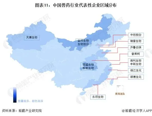 在全国范围内,兽药行业企业分布广泛,其中长三角、中部地区、华南地区及内蒙古自治区一带相对更为集中。长三角地区的代表企业包括海利生物、钱江生化等;中部地区河南、湖北省落户有回盛生物、科前生物、普莱柯等。