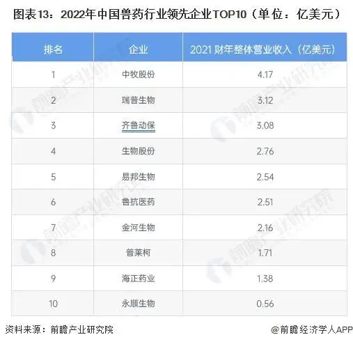 2022 年 12 月,国际畜牧网发布了《2022 年全球动保企业五十强榜单》,榜单中共有十家中国企业入选,包括中牧股份、瑞普生物等上市公司,十家企业 2021 年合计收入 24 亿美元,较 2020 年同比增加 18.5%。