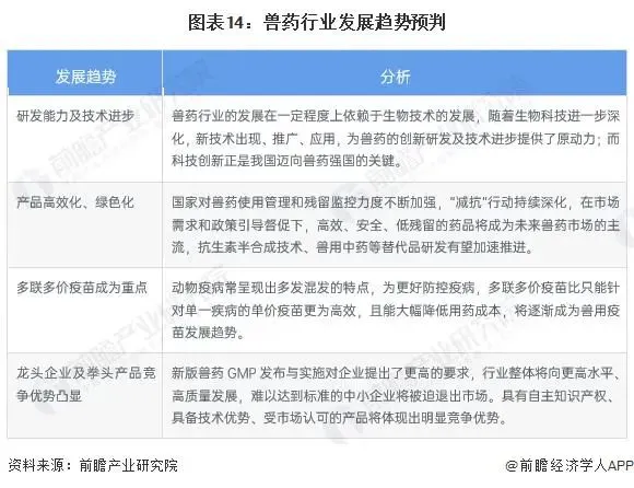 随着下游养殖业、畜牧业、宠物业对于动物疫病的防范意识提高,市场对于兽药产品的需求将持续提升,兽药行业有望迎来新的发展。未来,我国兽药行业产品将向绿色化发展,疫苗需求向多联多价化转变,新工艺、新兽药、新疗法的推行都离不开研发能力及技术的进步。