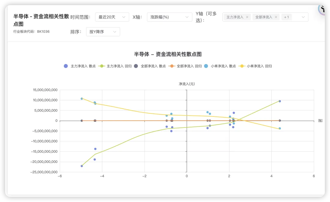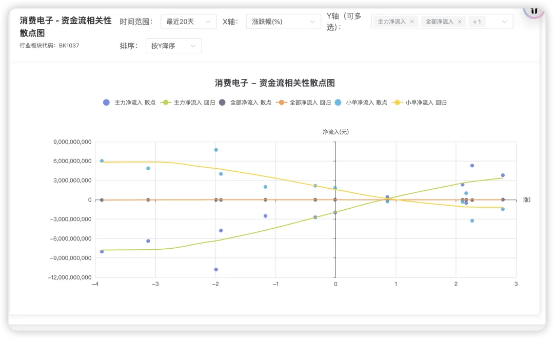 比如这是一个涨跌幅和资金流入之间的多项式回归曲线,表现的是不同类型资金和股票的涨跌幅、振幅、换手率之间的关系,可能不同的行业表现出来的相关性不一样。