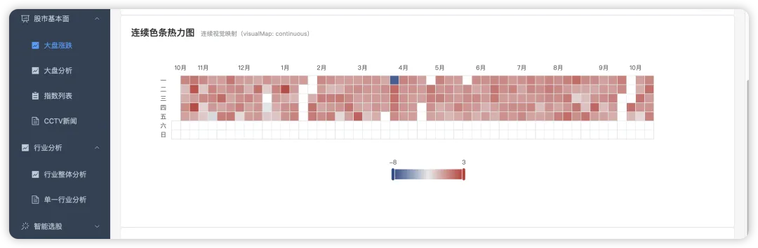 热力图分为两种,一种是对涨跌幅范围进行颜色展示的,能比较清晰看到哪些是涨的,哪些是跌的,但是这个涨跌分为不同色系有个问题是,你看不到极端涨跌的地方。