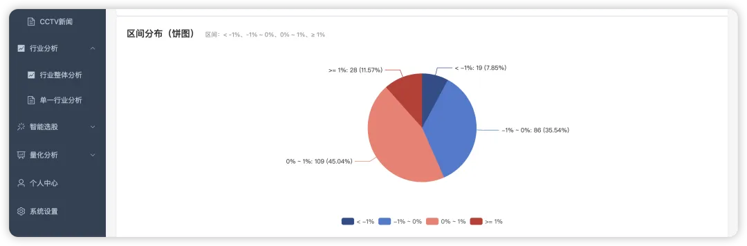 还有这个涨跌饼图,大涨大跌在我们大盘中,都是小概率事件,基本上都是微涨微跌,当然没有其他年份的数据,我们也不好做对比,但是有的话,我们大概可以看出这个风格之间的区别。