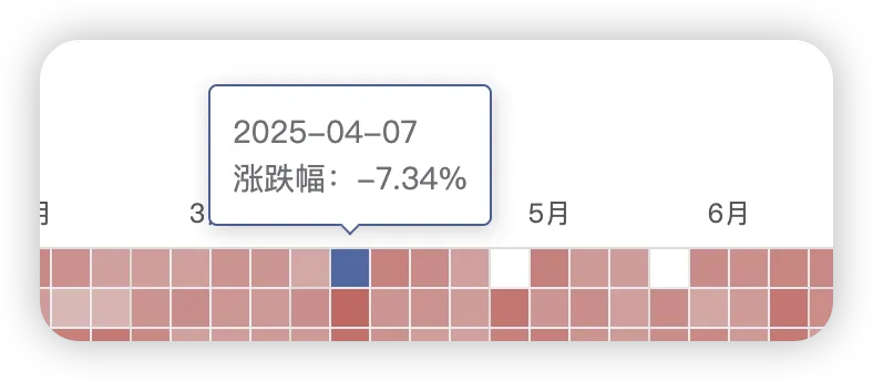 所以我又增加了色条热力图,可以看到一年内极端涨跌的日子【其实人和金鱼没有什么两样,很难记得清楚很多事情,比如这个4月7号的大跌,如果不是这张图,我是不会在意它的】