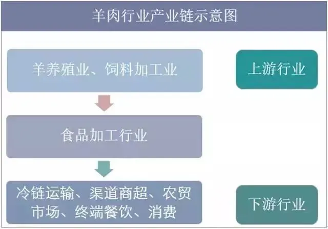 中国羊肉行业产业链主要包括上游第一产业羊的养殖业以及饲料加工业;第二产业的高低温及冷鲜肉加工,再经过物流、包装等链条,羊肉产品最终到达消费者终端。